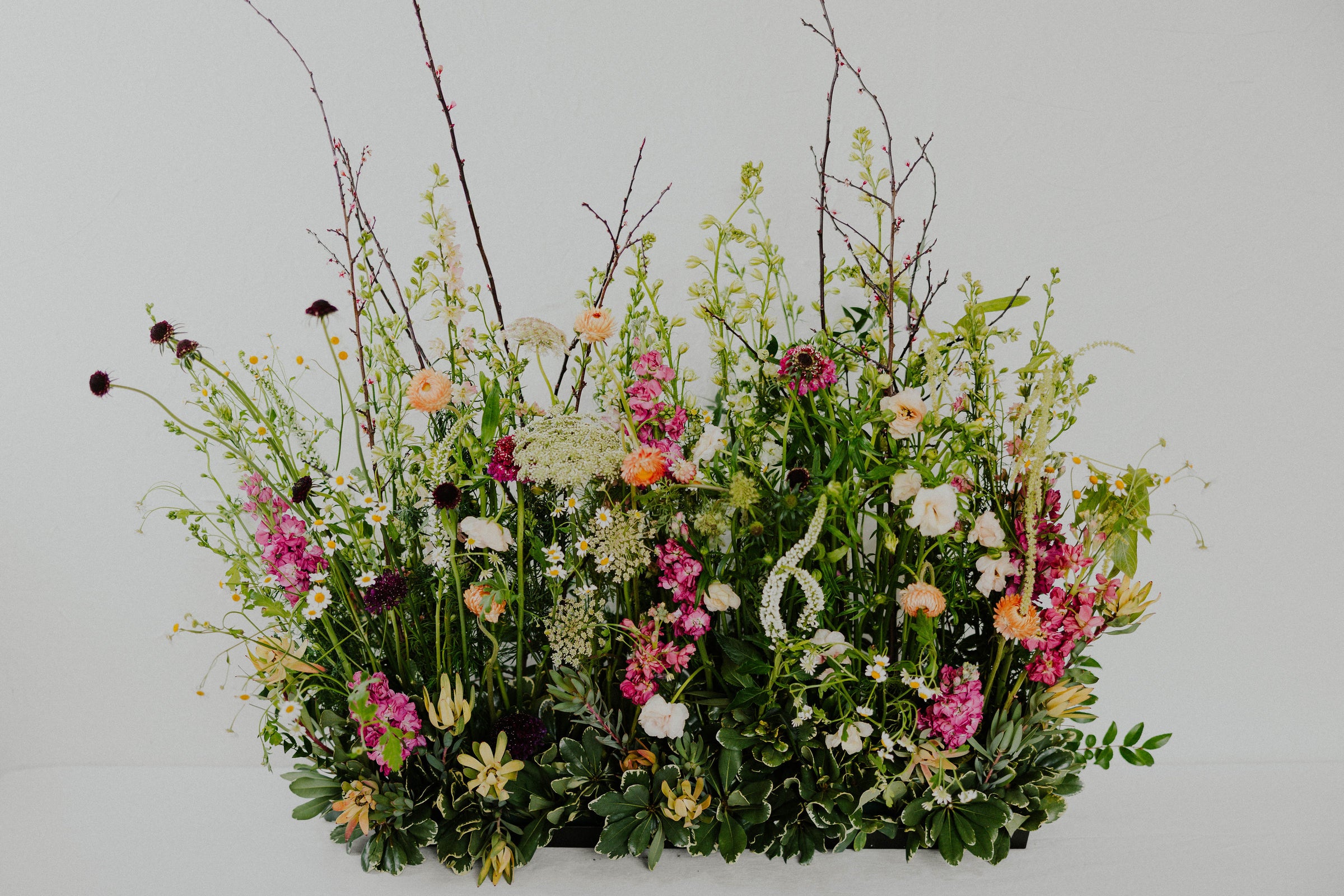 A lush, garden-style floral meadow overflowing with fresh, seasonal blooms, thoughtfully designed to evoke the beauty of a flourishing garden. This serene and natural arrangement is perfect for placing at the foot of a casket, on a welcome table, or as a heartfelt tribute at the church altar.